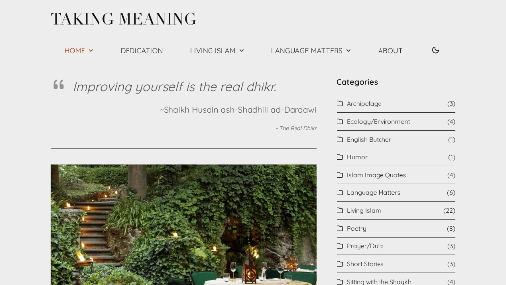 Taking Meaning adalah sebuah blog pribadi yang menyajikan inspirasi dalam hidup ber-Islam secara mendalam. Seperti meningkatkan esensi dari makna yang kita alami sehari-hari, dihimpun layaknya minyak mawar yang diperoleh dari kelopak penuh makna: lembut, asli, dan menyentuh hati.
